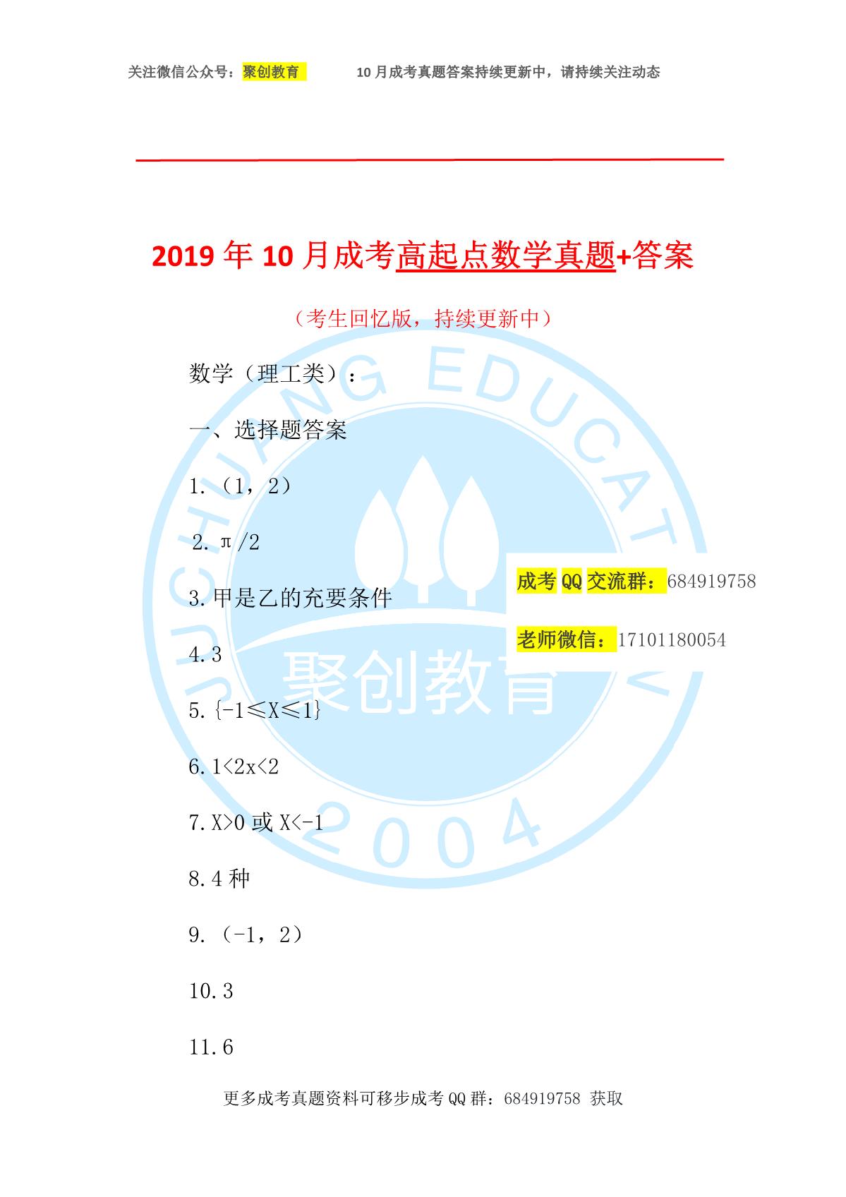 附件:2019年10月成考高起点数学真题+答案(考生回忆版,持续更新中)