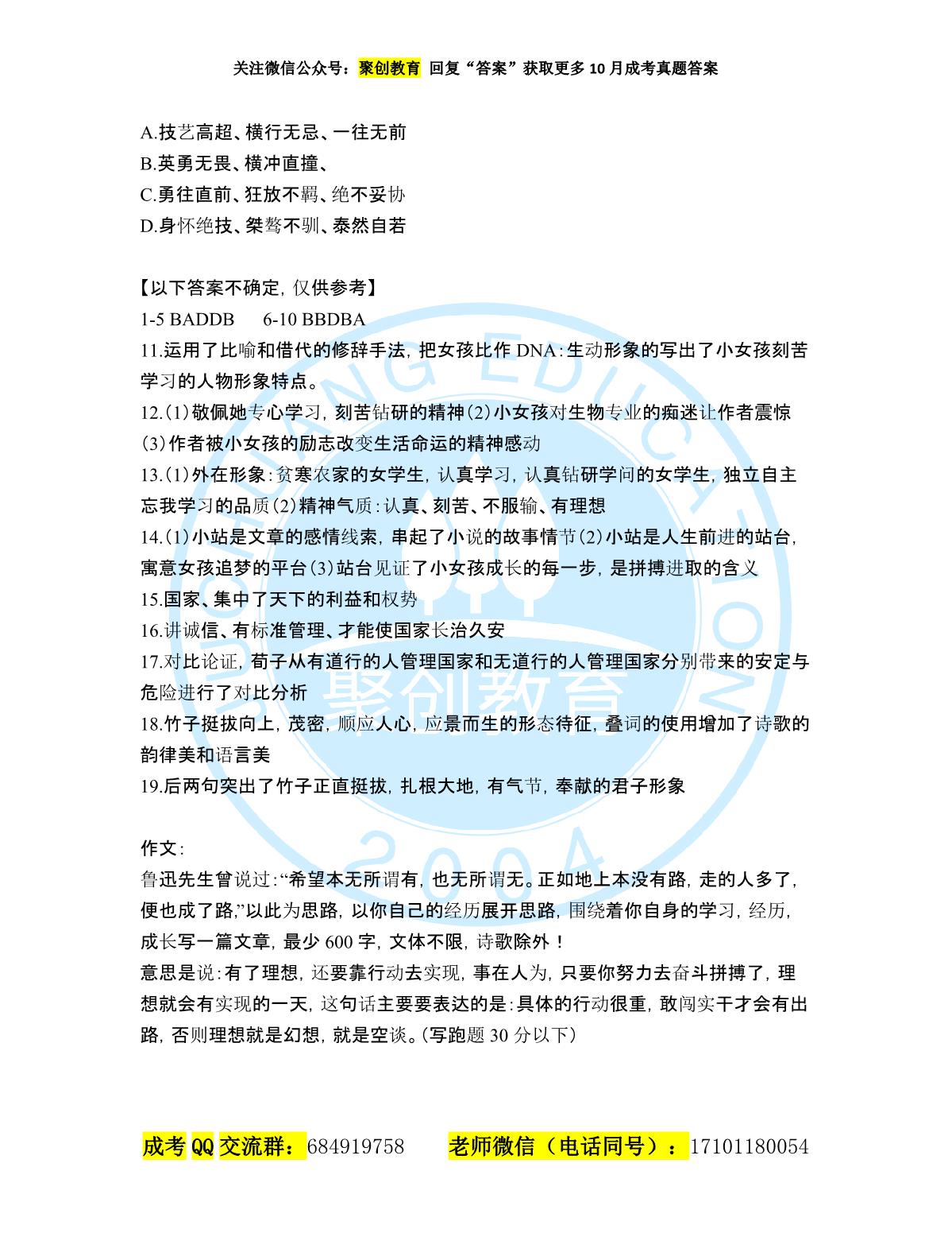 以上内容由聚创学历提升整理发布,由于成考考试属于国家统考考试,所以成考的考试真题和答案没有那么快的公布,目前是根据参加了当次成考考生的回忆进行梳理的答案,各位考生的最终成绩以11月中下旬左右考试院公布的成绩为准,想要知道更多的成考真题答案,可以关注我们的微信公众号:聚创教育,我们将持续更新一手相关真题答案等资讯,考生若回忆起真题,但想确定答案的话,也可以将题目发送给我们,我们会在第一时间通知您具体的答案。
