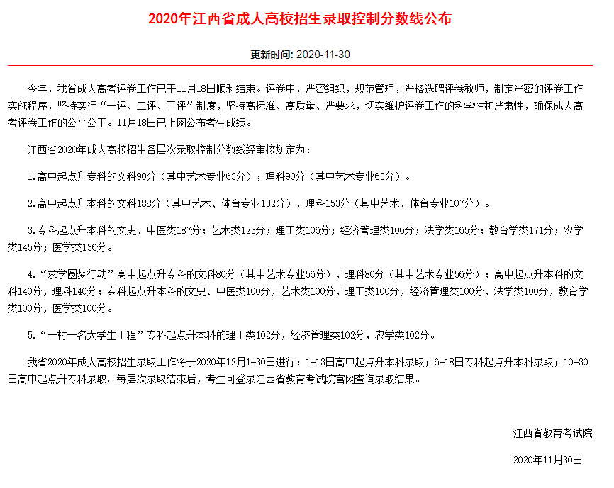 江西省历年成考录取分数线