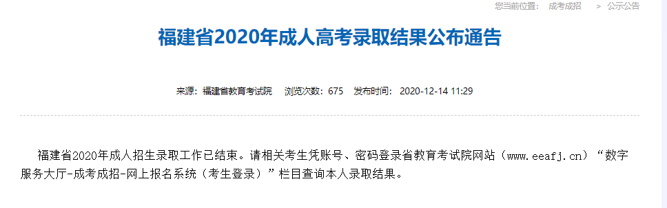福建省2020年成人招生录取工作已结束。请相关考生凭账号、密码登录省教育考试院网站“数字服务大厅-成考成招-网上报名系统(考生登录)”栏目查询本人录取结果。