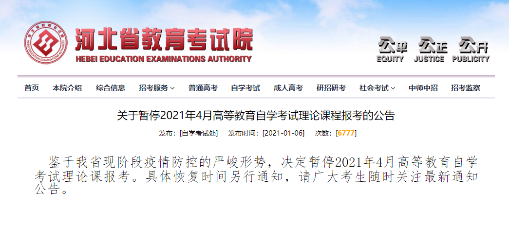 鉴于我省现阶段疫情防控的严峻形势,决定暂停2021年4月高等教育自学考试理论课报考。具体恢复时间另行通知,请广大考生随时关注最新通知公告。