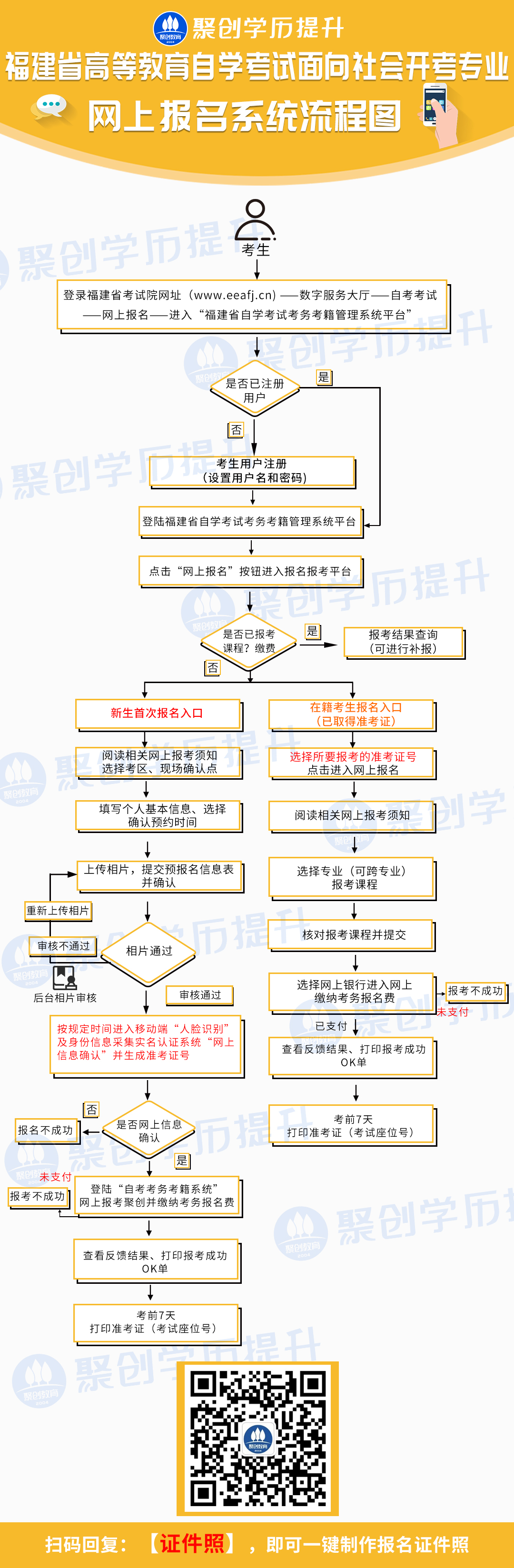 为了方便各位考生进行报考,小编在这里为大家制作了更为详细的报名流程图,大家如果有什么疑问可以在公众号中回复自考,或者选择扫码关注公众号,即可获取更多的报名资讯信息。
